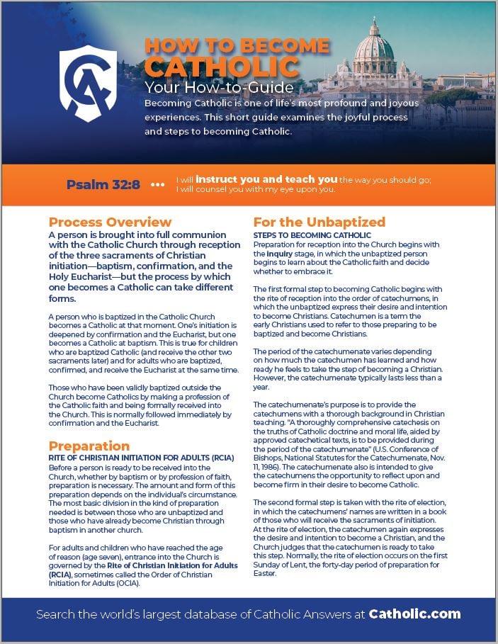 Becoming Catholic is one of life’s most profound and joyous experiences. Some are blessed enough to receive this great gift while they are infants, and, over time, they recognize the enormous grace that has been bestowed on them. Others enter the Catholic fold when they are older children or adults. This tract examines the joyful process and steps to becoming Catholic.